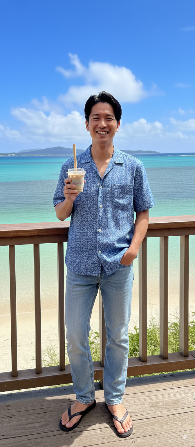 ドリンクを片手に海を眺めている日本人男性を生成してみてください。